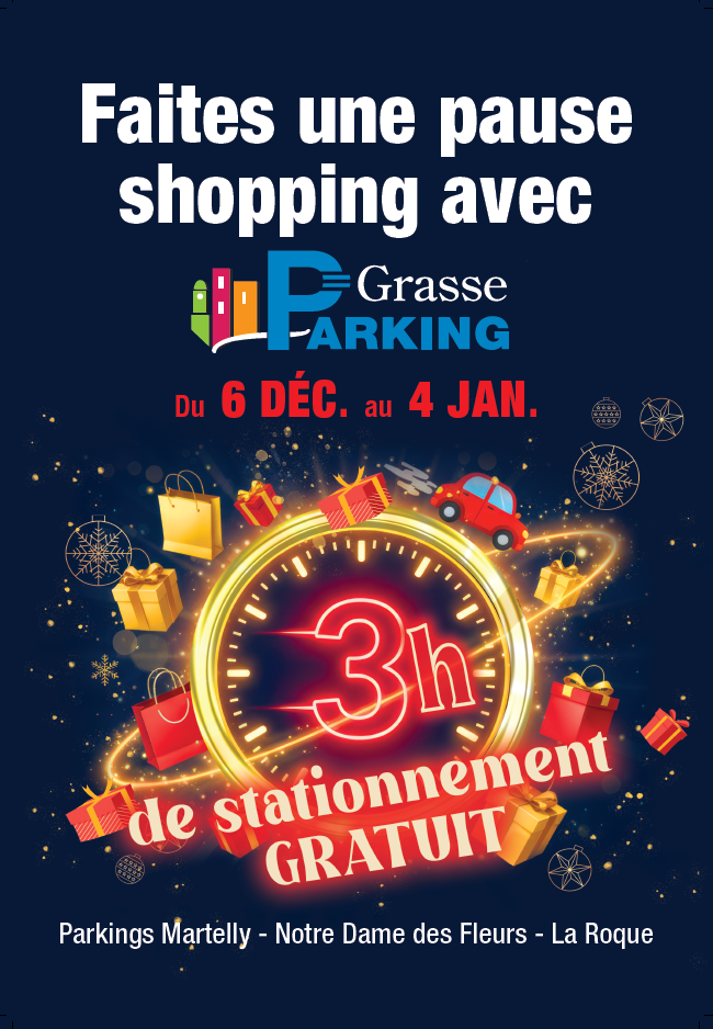 Grasse Parking vous offre votre premier cadeau : 3h de stationnement gratuites jusqu’au 4 janvier 2026 dans les parkings en régie municipale. Une bonne nouvelle pour les fêtes 🎁Profiter sereinement des animations et de vos achats de Noël. Flânez, dégustez, partagez… et profitez du centre-ville sans vous presser !