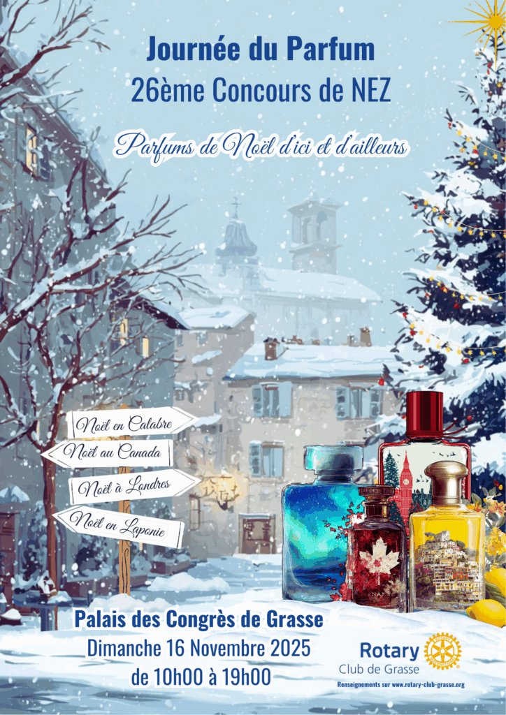 Pour cette nouvelle édition de la Journée du Parfum, le Rotary Club de Grasse explore les parfums de Noël, d’ici et d’ailleurs. Rendez-vous dimanche 16 novembre au Palais des Congrès pour rencontrer les professionnels de la filière et participer au traditionnel Concours de Nez.
